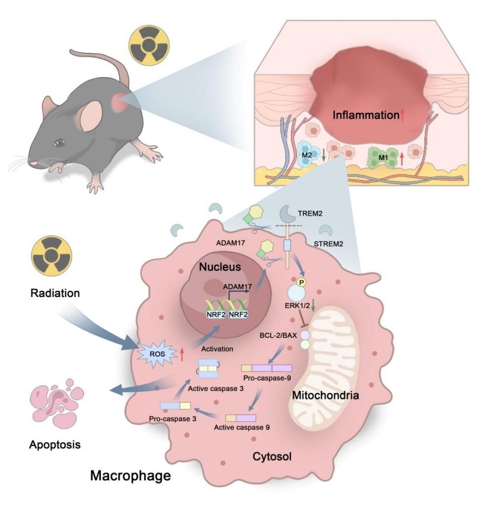 This work identifies a previously unrecognized regulatory cascade: “ROS–NRF2–ADAM17–TREM2–ERK” governs macrophage fate under radiation stress. The findings provide mechanistic insight into immune dysfunction in radiation injury and highlight TREM2 as a promising therapeutic target.