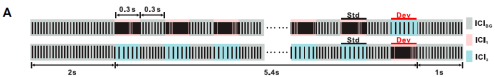 To probe higher-order temporal structure processing, the study introduced a click-train-based oddball paradigm (Fig. 3-1). This paradigm involved continuous click trains in two configurations: an initial 2-s consistent background click train (ICIBG, gray background in Fig. 3-1), followed by alternating click trains marked by ICI1 (red background in Fig. 3-1) and ICIBG every 300 ms. This sequence was repeated 9 times (for 5.4 s) followed by a deviant train with ICI2 (blue background in Fig. 3-1). In the counterpart setup, the roles of the standard and deviant trains were reversed, while maintaining the background train constant.