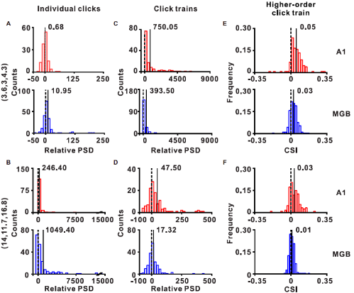 Using the common SSA index (CSI), the study quantified third-level processing during single-unit recordings in A1 and MGB. Population analyses revealed that A1 robustly encoded temporal information across all three levels, whereas the MGB showed strong synchronization to individual clicks but comparatively limited capacity for integrating click-train objects or detecting higher-order deviations (Figs. 3-2, 3-3, 3-4). Thus, the primary auditory cortex demonstrated greater functional specialization for long-range temporal structure.