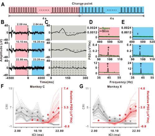 The researchers first employed a classical transitional click-train paradigm (Fig. 1A). This stimulus comprises two consecutive regular click trains with distinct inter-click intervals (ICIs). Electrocorticography (ECoG) recordings from macaque auditory cortex revealed pronounced transition-evoked change responses, whose magnitudes systematically decreased as the ICI increased. Fast Fourier Transform (FFT) analysis showed that synchronization to individual clicks (reflected by power spectral density peaks at corresponding repetition rates) strengthened with increasing ICI (Figs. 1B-E). Importantly, when ICIs fell within approximately 6–18 ms, both robust change responses and reliable click-level synchronization co-occurred, indicating simultaneous representation of fine-scale temporal cues and coarse-scale structural transitions (Figs. 1F-G). This co-representation was termed temporal integration during synchronization (TIDS), reflecting the auditory cortex’s capacity to integrate temporal information while phase-locking to rapid inputs.