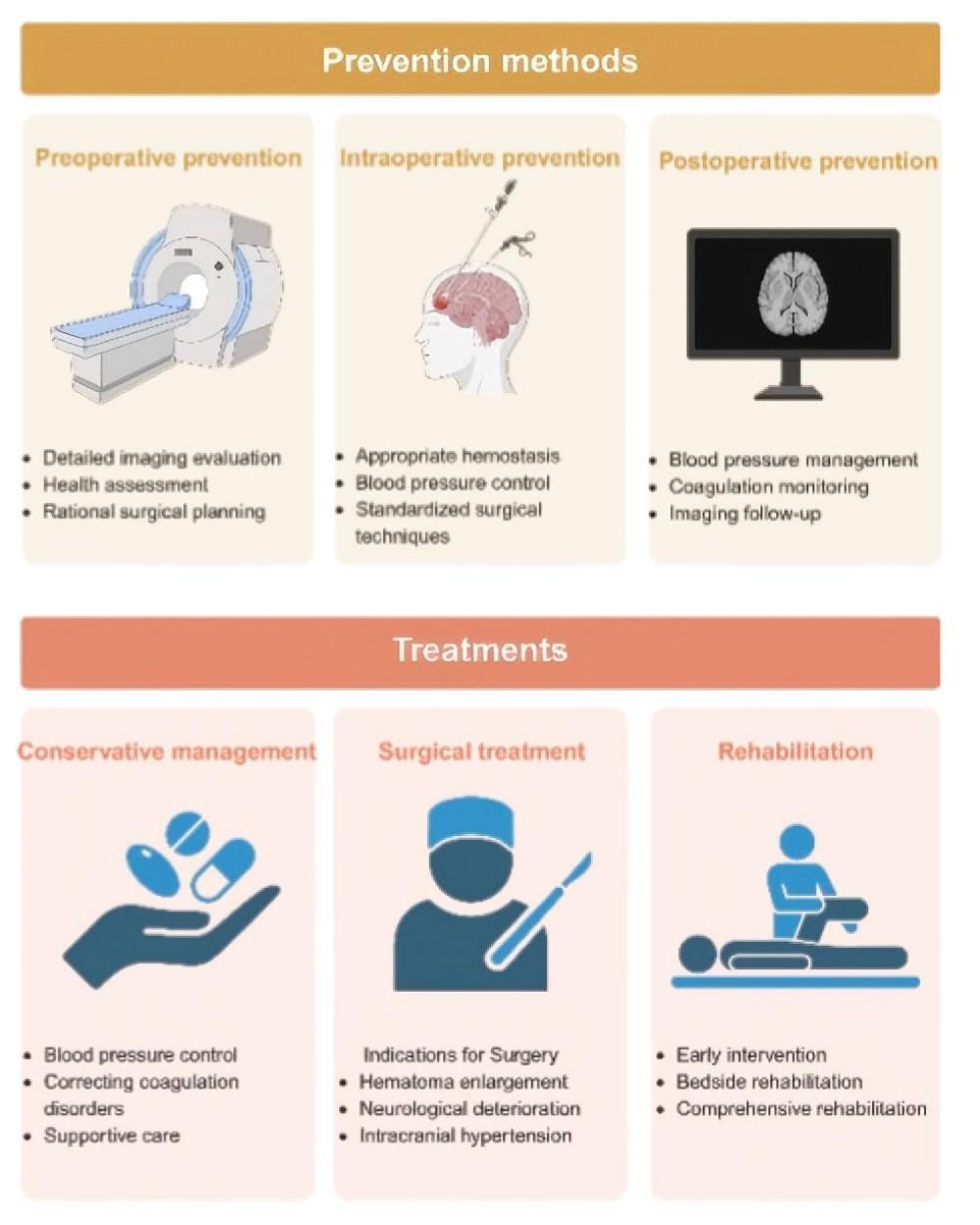It systematically delineates a prevention chain spanning preoperative assessment (imaging and functional status), intraoperative management (precise hemostasis and blood pressure control), and postoperative monitoring (strict blood pressure reduction and coagulation correction). Furthermore, it details a stepwise treatment strategy guided by hematoma stability, mass effect, and neurological status, progressing from conservative care (intensive blood pressure lowering, coagulation reversal) to surgical intervention (when necessary) and early systematic rehabilitation.