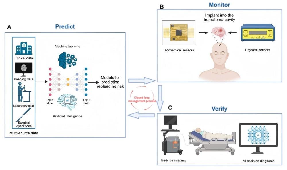 Transcending the scope of a traditional review, this article’s most groundbreaking contribution is the proposal of a visionary "Intelligent Closed-Loop Management" model. This model aims to catalyze a paradigm shift in postoperative rebleeding monitoring—moving from the current "lagging and passive" reliance on intermittent CT scans to a "real-time, proactive, and intelligent" approach. The core system comprises three pillars: