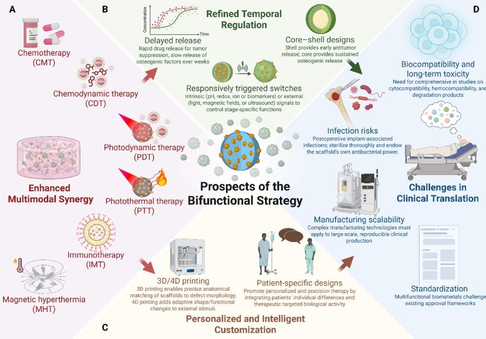 The advancement of biomaterials technology offers a promising strategy to address these dual challenges concurrently. These materials can function as localized drug delivery systems that enhance antitumor efficacy while minimizing systemic toxicity. Moreover, they have facilitated the application of novel therapeutic modalities, such as photothermal, magnetic hyperthermia, microwave thermal, chemodynamic, and sonodynamic therapies. Crucially, these biomaterials are also designed to provide structural support and biological cues for bone regeneration, thereby fulfilling the goal of bifunctional integration.